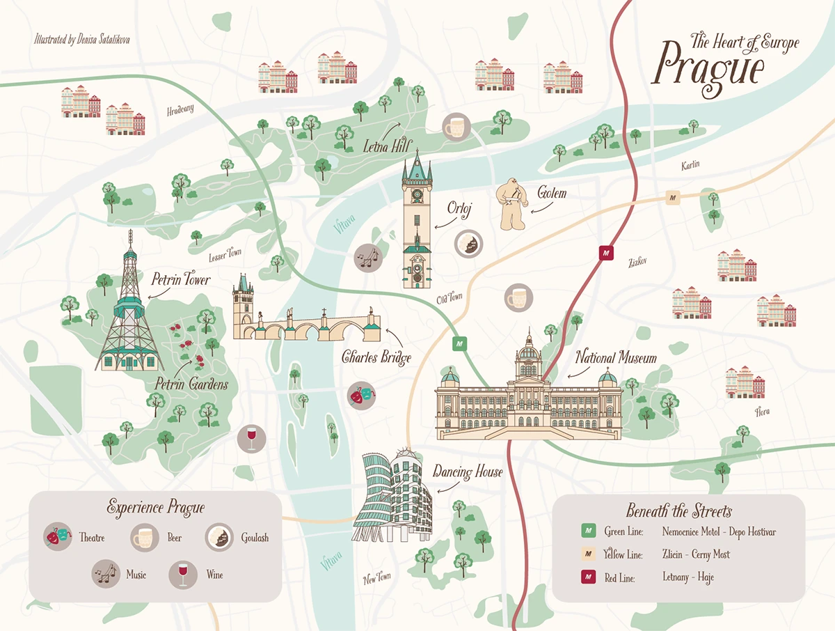 A stylized map of a tourist attraction, focusing on the capital of my home country, the Czech Republic. Known worldwide for its rich history, stunning architecture, and vibrant culture, Prague is often called ‘The Heart of Europe’. This title reflects both its central geographical location within Europe and its historical role as a crossroads for diverse cultures and influences.