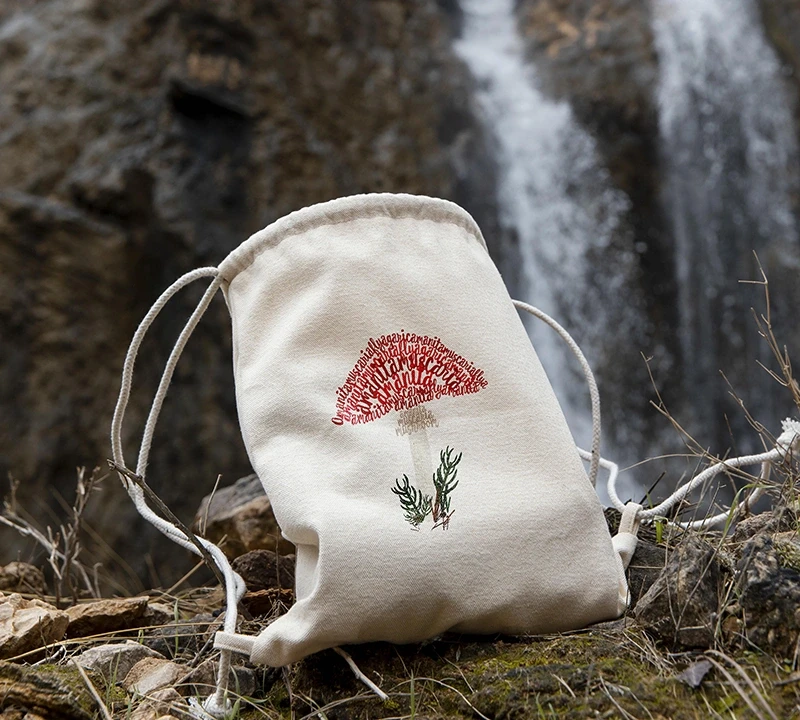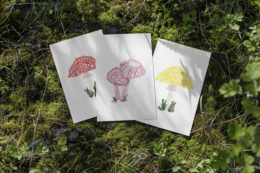 Design of a Mushroom Book: A Little Mushroom Field Guide, featuring a minimalistic page layout and illustrations created solely using letters and characters from a typeface of my choice.