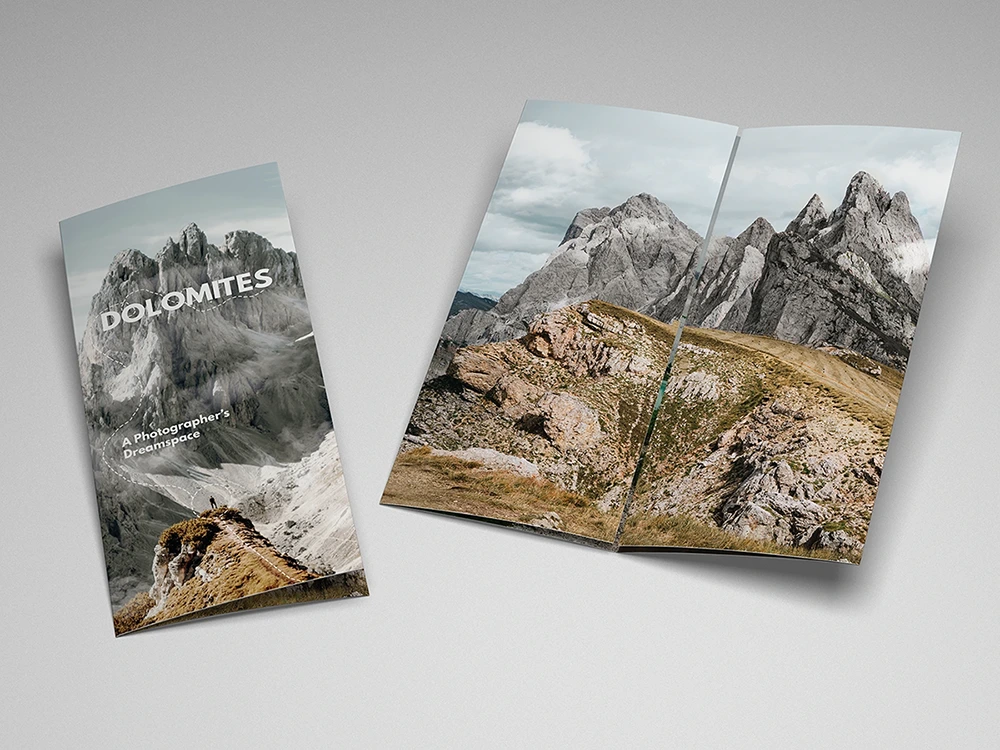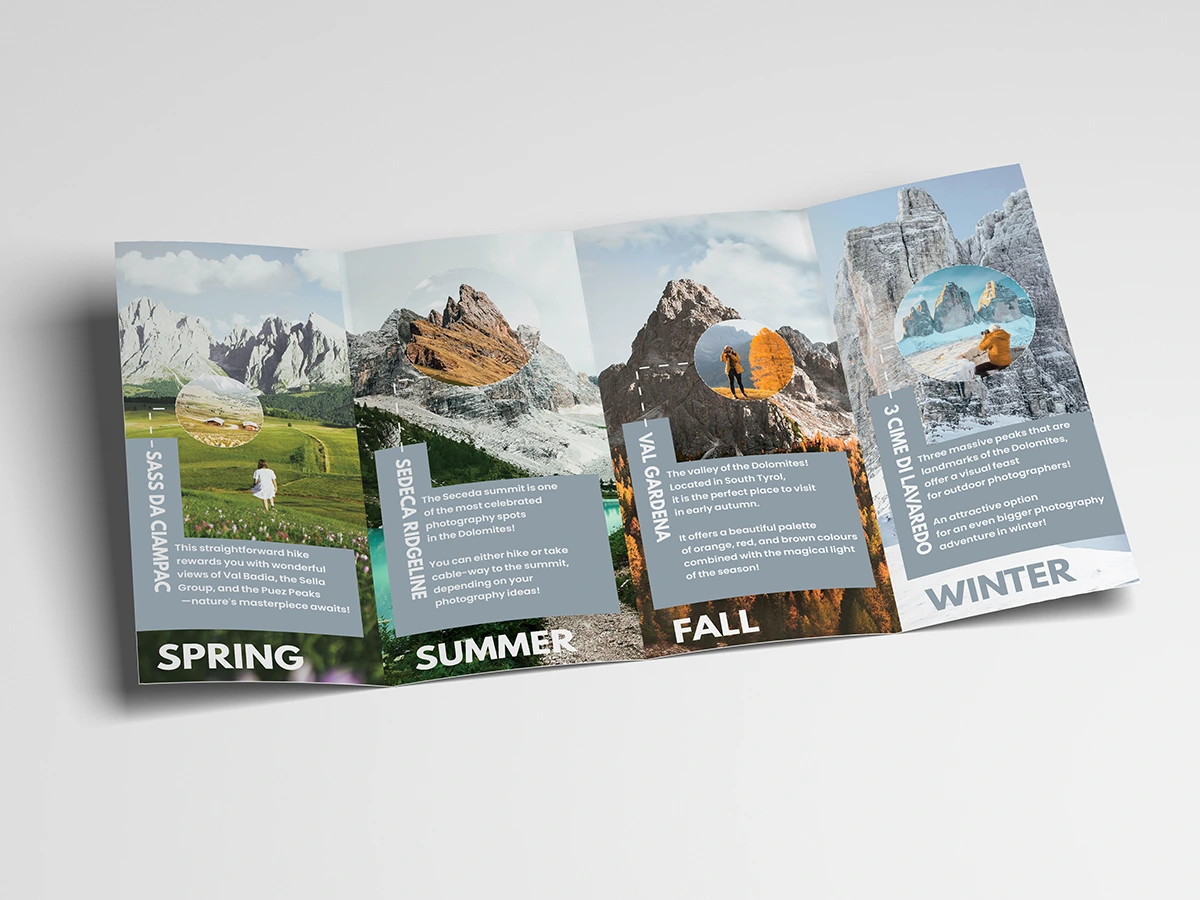 This travel brochure was designed to inspire outdoor professional photographers to explore the Dolomites, Italy, capturing the breathtaking beauty of its mountains and surrounding landscapes in every season.